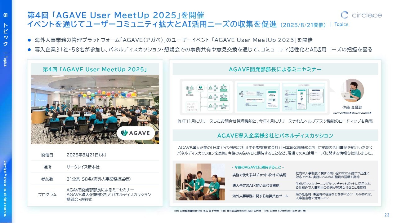 当社では今年8月に「AGAVE User MeetUp 2025」を開催し、31社58名の契約ユーザーの方々にご参加いただきました。本イベントを通じて、ユーザーコミュニティの拡大およびAI活用ニーズの収集を促進しています。