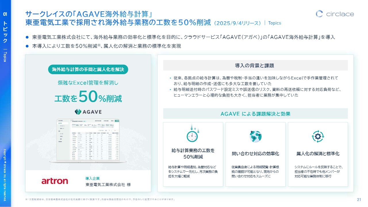 サークレイスの「AGAVE海外給与計算」東亜電気工業で採用され海外給与業務の工数を50%削減 (2025/9/4リリース)