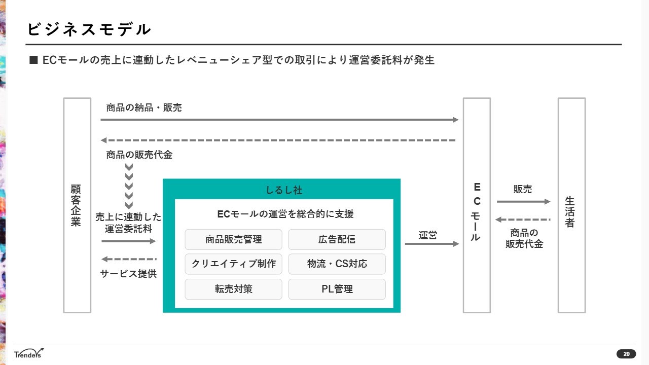 クライアント企業のECモールでの売上高や商品の販売代金の一部を売上に連動するかたちで、レベニューシェアとして運営委託料を得るビジネスモデルとなっています。そのため、顧客から運営を請け負っているECモールの売上が上がるほど、しるし社の業績も向上していきます。