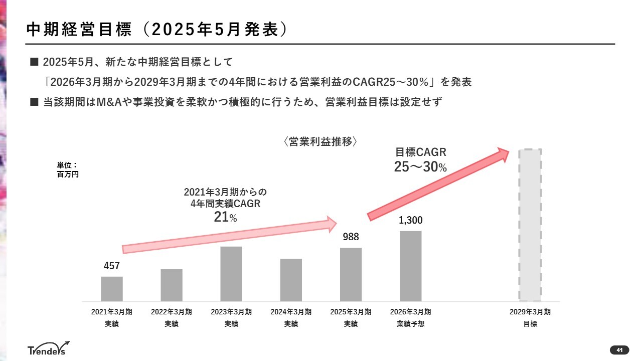 2025年5月に発表した新たな中期経営目標として、2026年3月期から2029年3月期までの4年間における営業利益のCAGRを25パーセントから30パーセントとすることを掲げています。