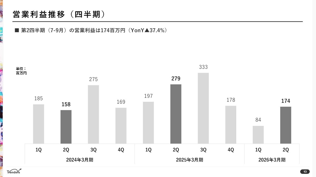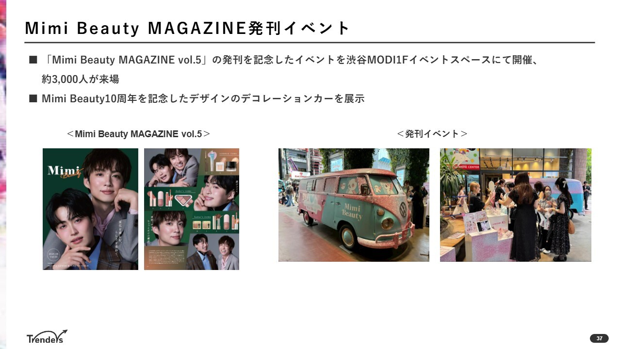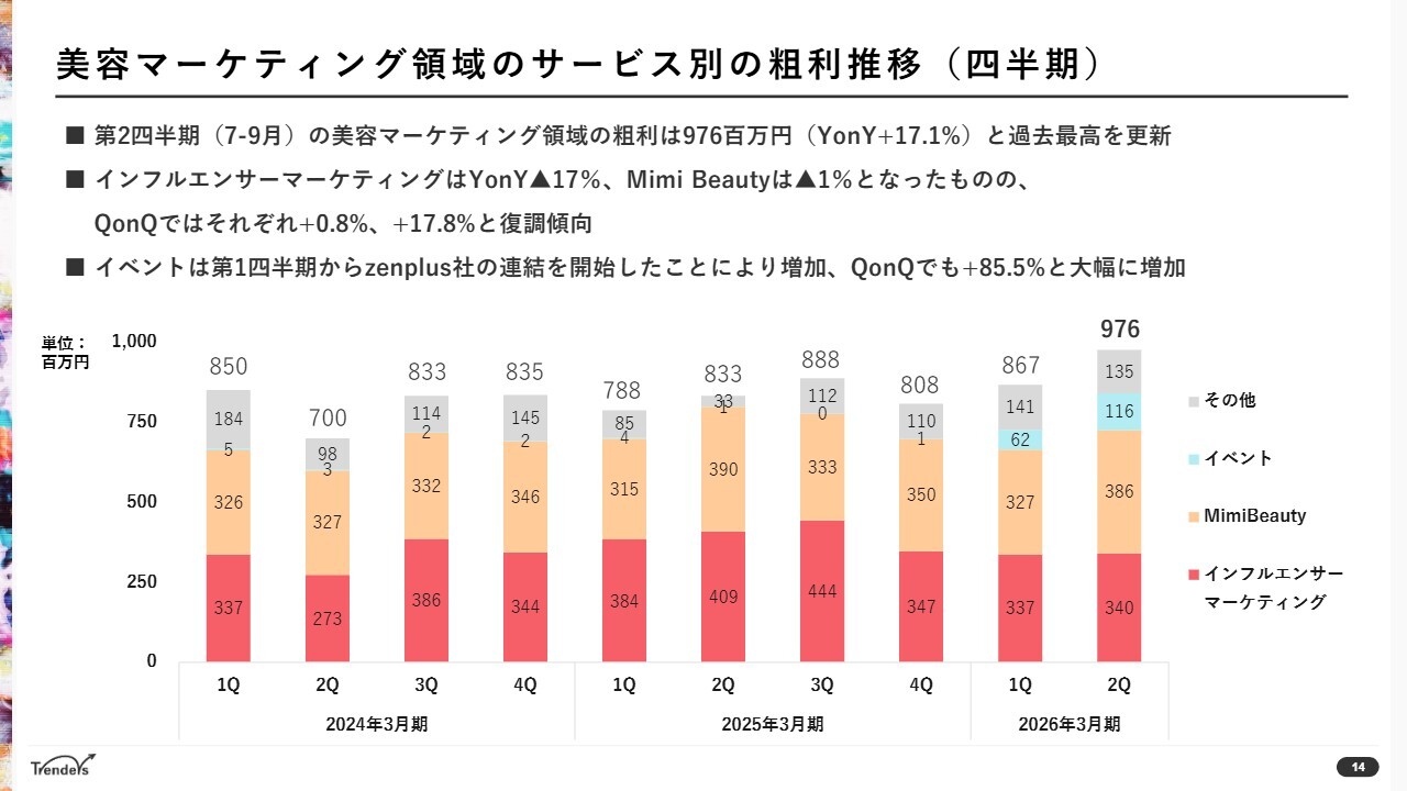 主要サービスであるインフルエンサーマーケティングと「Mimi Beauty」は、前年同期比では減少しましたが、前四半期比ではそれぞれ増加しており、復調傾向にあります。