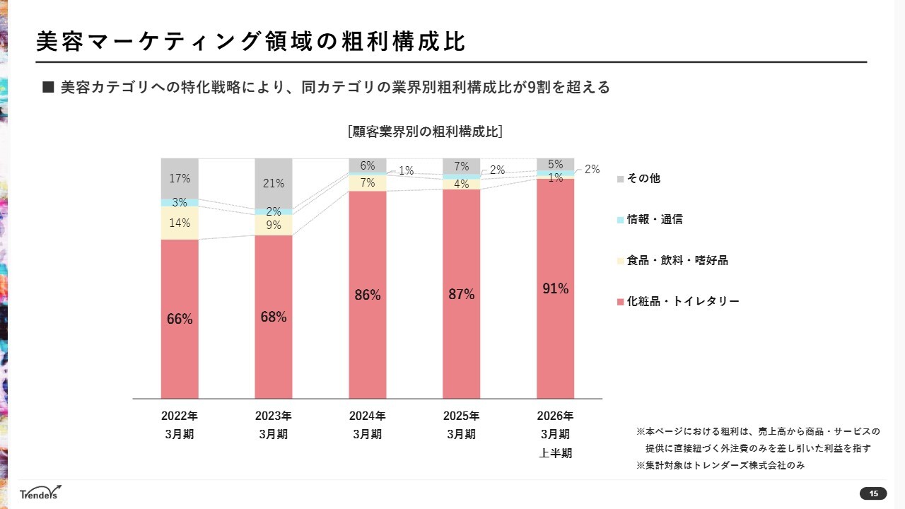 美容マーケティング領域の粗利構成比です。以前から戦略的に美容カテゴリに特化してきたこともあり、足元では91パーセントが化粧品・トイレタリー領域となっています。