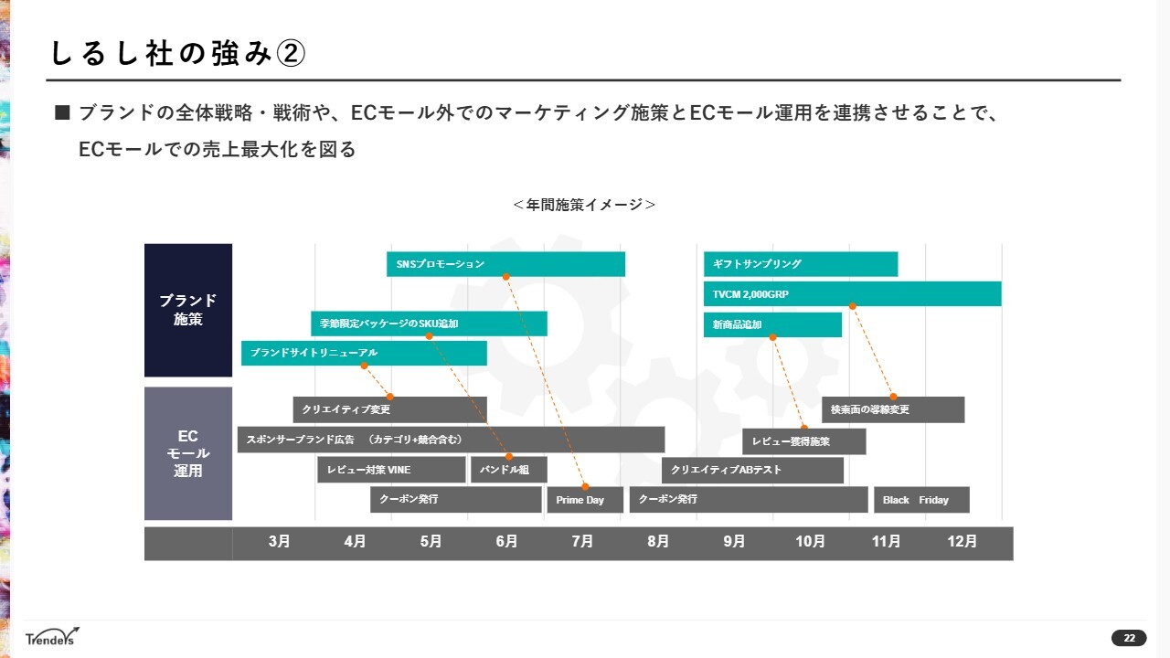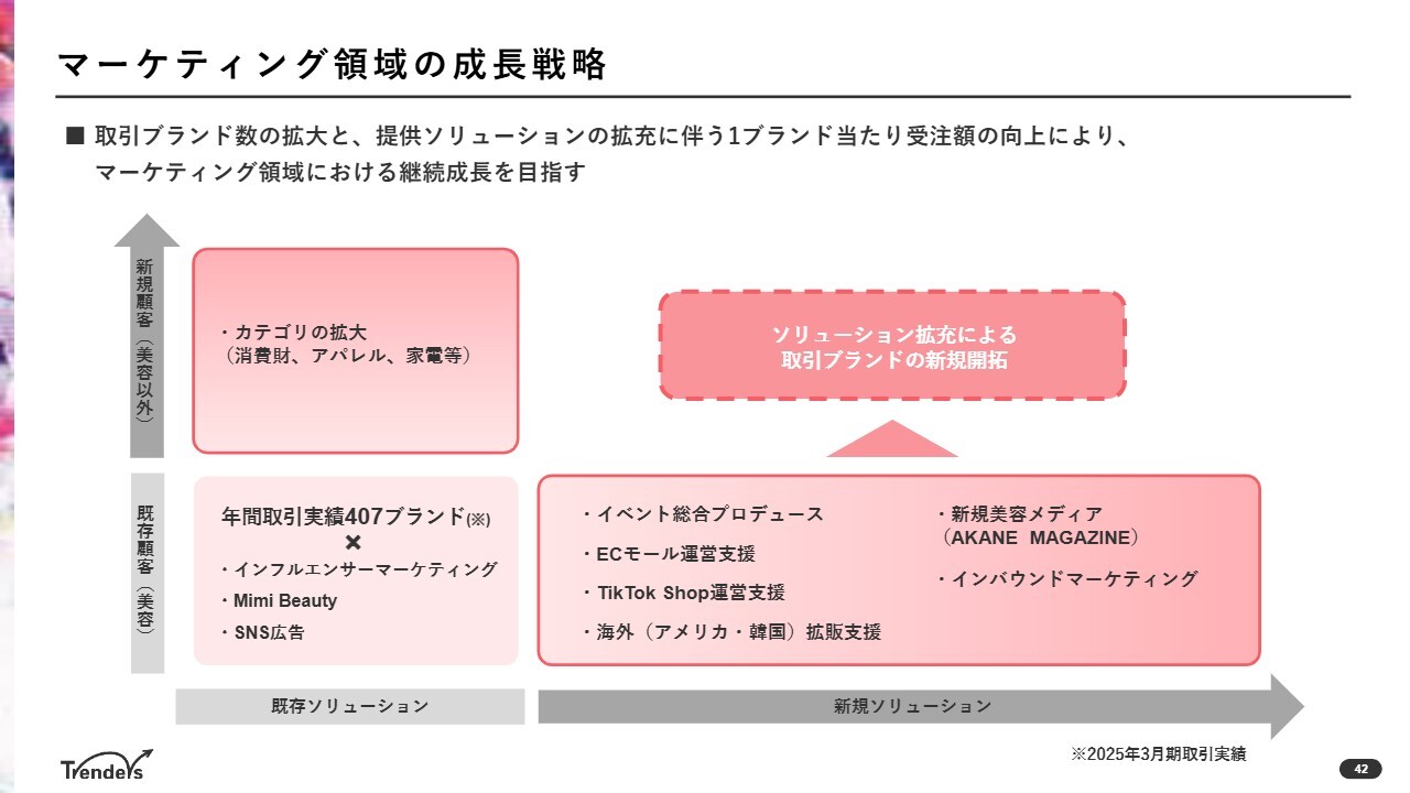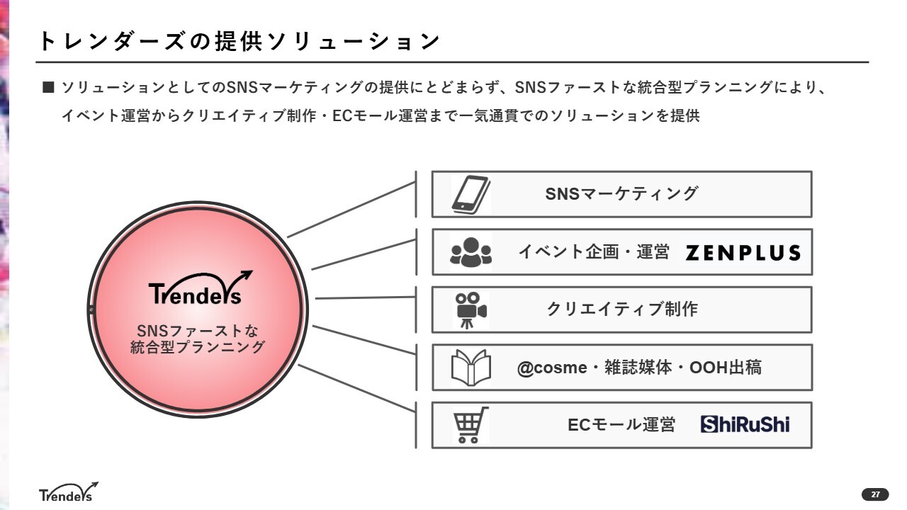 この目標達成に向けて、当社が既存で行ってきた主に美容ブランド向けのSNSマーケティングの提供を行っていきます。加えて、イベント開催や今回のしるし社のM&AによるECモールの運営支援、海外拡販支援、さらに新たに立ち上げた美容誌を含むソリューションの拡大を進めていく予定です。