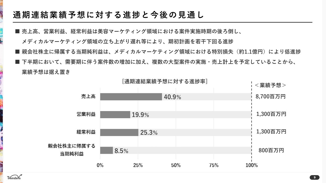 通期連結業績予想に対する進捗と今後の見通しです。売上高、営業利益、経常利益は、美容マーケティング領域における案件実施時期の後ろ倒しや、メディカルマーケティング領域の立ち上がり遅れ等により、期初計画を若干下回る進捗となっています。