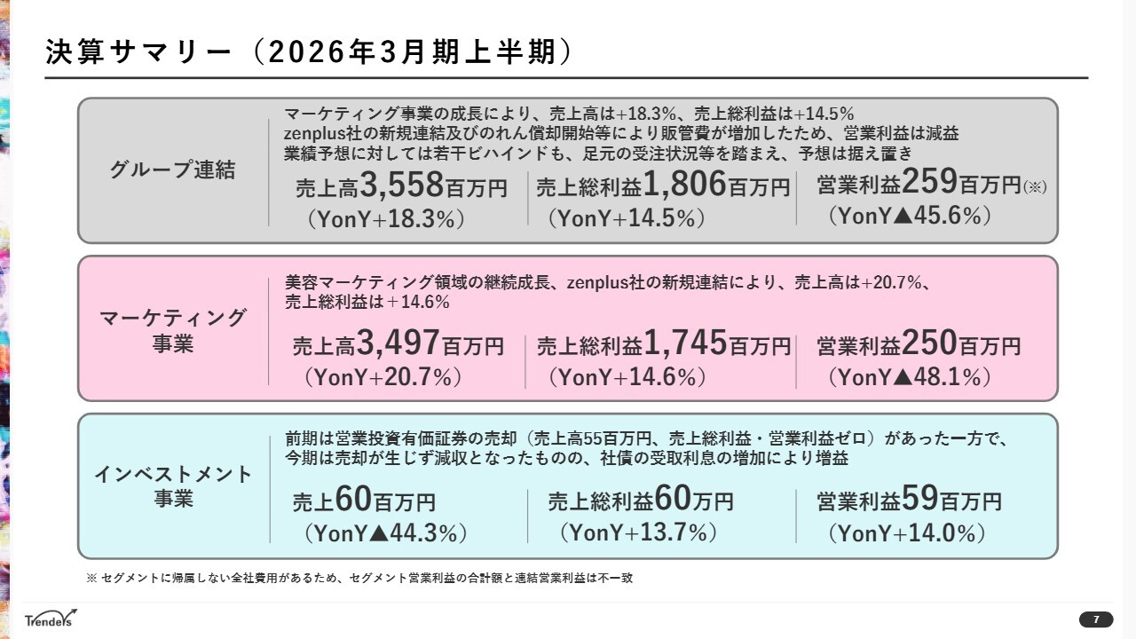 田中隼人氏:みなさま、こんにちは。トレンダーズ株式会社取締役CFOの田中です。本日は、当社の2026年3月期第2四半期の決算説明会へご参加いただき、ありがとうございます。