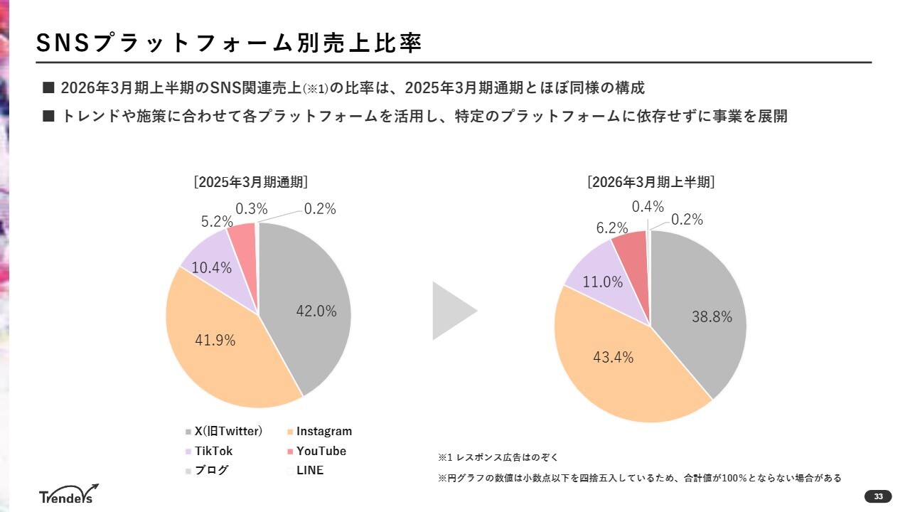 SNSプラットフォーム別売上比率です。スライド左側のグラフが2025年3月期通期、右側が2026年3月期上半期の実績を示しています。