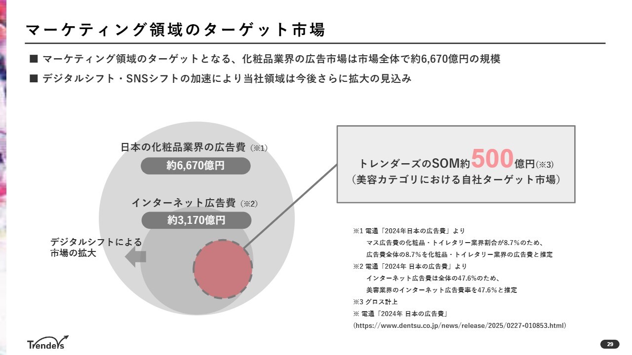 化粧品業界の約7,000億円弱の広告費市場の中の、デジタルシフトやSNSシフトの動きを確実に取っていきます。同時に、この広告費市場には含まれていないECモールの運営代行やイベントといった領域も、しっかり拡大していきたいと考えています。
