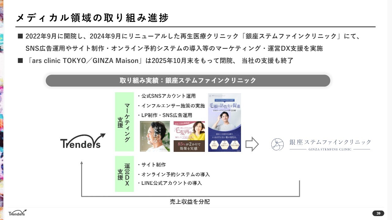 メディカル領域では、アートメイクの「ars clinic TOKYO/GINZAMaison」と「銀座ステムファインクリニック」という、2つのクリニックのマーケティング支援を中心に事業を進めてきました。
