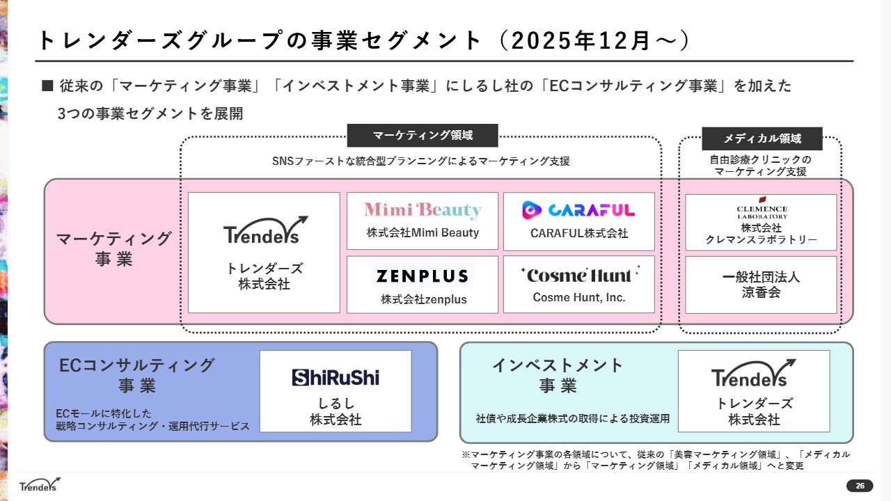 マーケティング事業については大きな変更はありませんが、従来は「美容マーケティング領域」と「メディカルマーケティング領域」という名称で領域を分けていました。