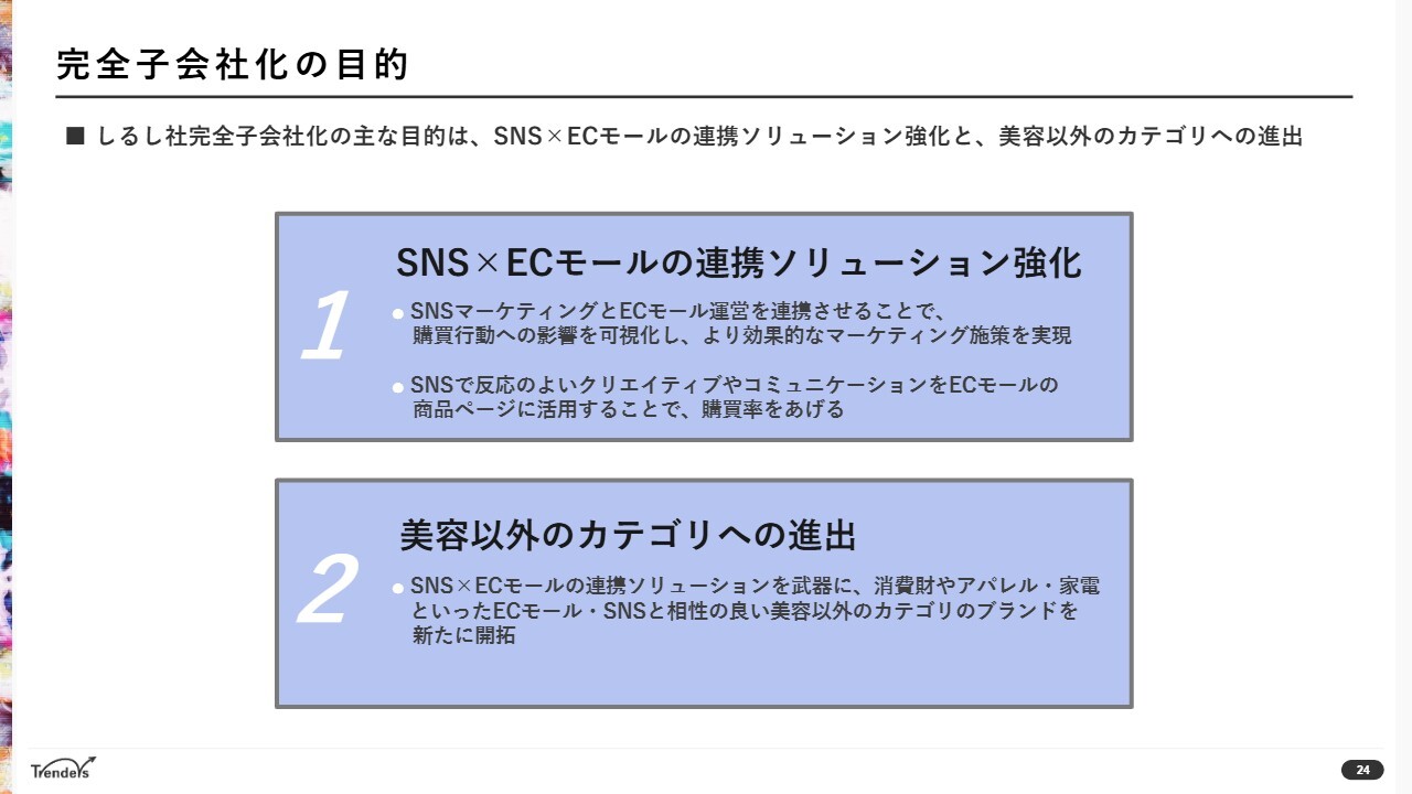 完全子会社化の目的です。しるし社はECモール運営において明確な強みを持ち、その結果として業績も順調に伸びています。その上で、弊社とのシナジーを考えると、大きく2つのポイントがあると認識しています。