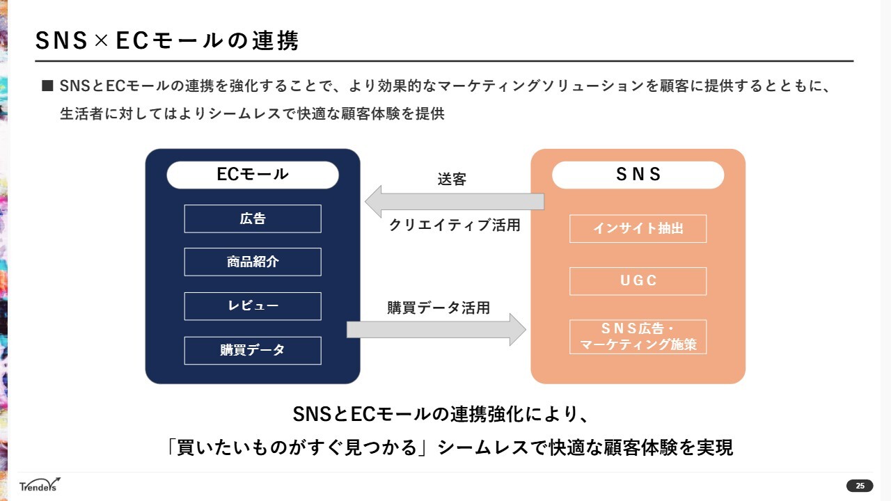 我々は、SNSとECモールを連携させることで、例えば現在SNSで話題となっているUGC(ユーザー生成コンテンツ)を商品ページに反映させ、また、SNSで評価の高いポイントを商品ページ内でより訴求します。