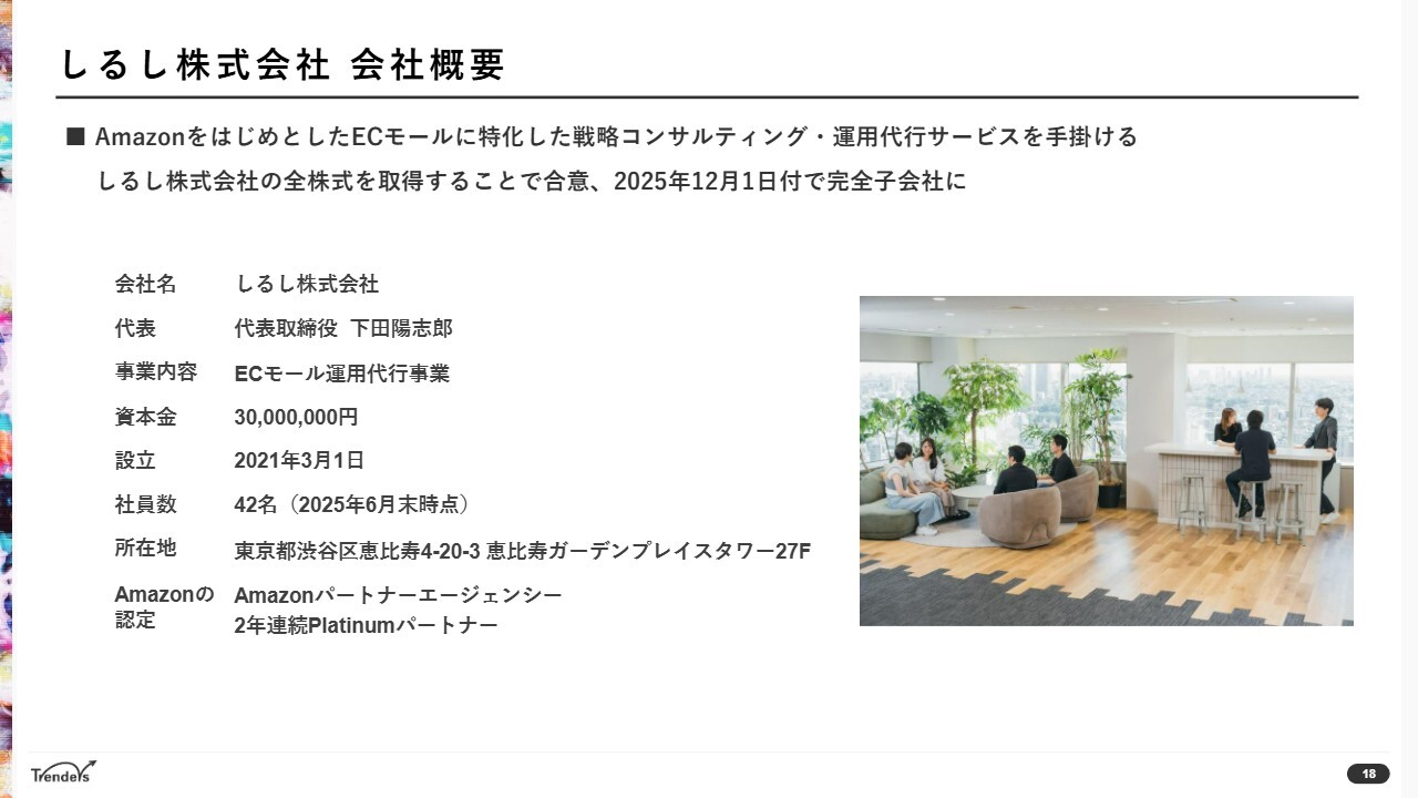しるし社の完全子会社化についてです。「Amazon」をはじめとしたECモールに特化した戦略コンサルティング・運用代行サービスを手がけている、しるし社の全株式を取得し、2025年12月1日付で完全子会社化します。