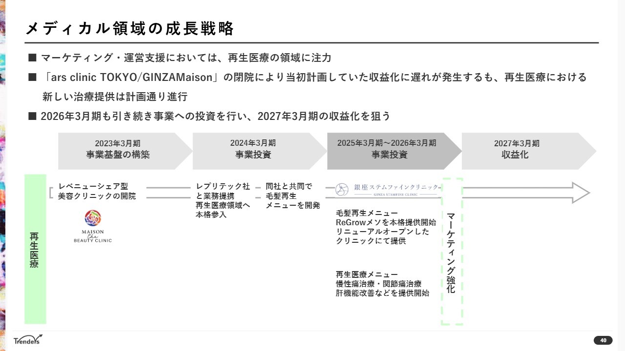 現在のメディカル領域の取り組みとしては、再生医療を手掛ける「銀座ステムファインクリニック」において、再生医療領域に特化したかたちで事業を継続しています。
