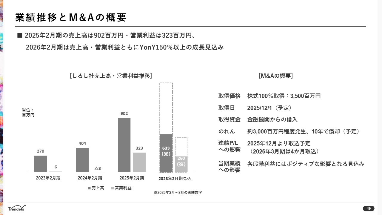 M&Aの概要は、スライド右に記載のとおりです。2025年12月1日付での完全子会社化となりますので、決算への取り込みは2025年12月からを予定しています。