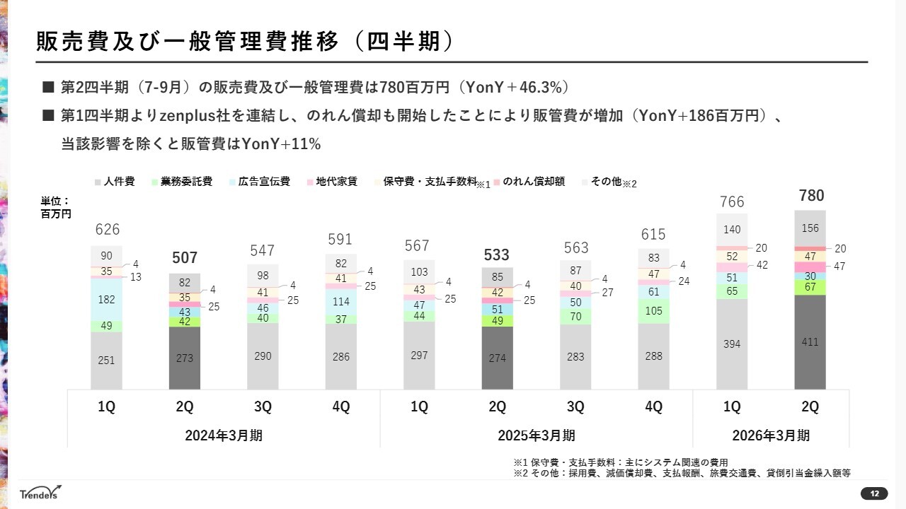 要因としては、zenplus社を連結し、それに伴うのれんの償却も開始したことにより、販管費が前年同期比で1.8億円増加したことが挙げられます。これを除くと、前年同期比で11パーセント増となります。