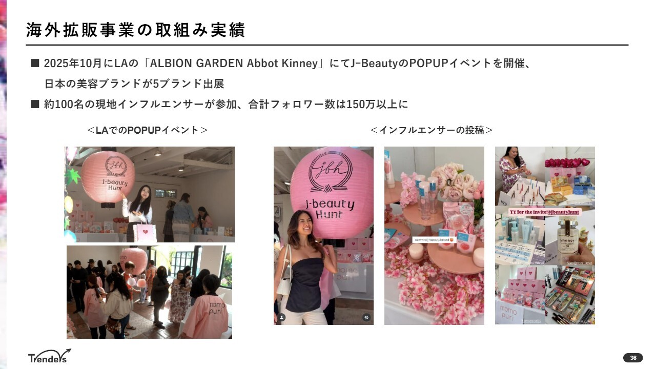 スライドは、10月にロサンゼルスの「ALBION GARDEN Abbot Kinney」で開催されたJ-Beautyのポップアップイベントの様子です。日本の美容ブランド5ブランドが出展しました。約100名の現地インフルエンサーが参加し、参加者の合計フォロワー数は150万以上になりました。