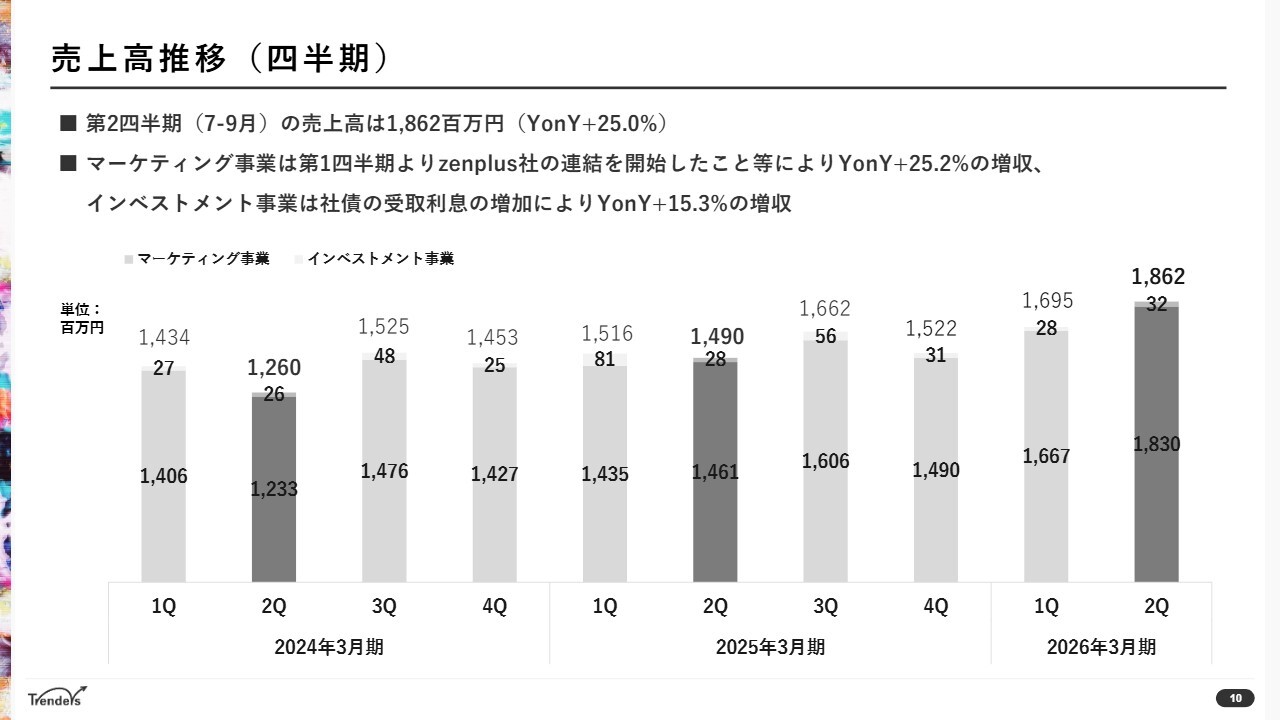 売上高推移です。第2四半期(7月から9月)の売上高は18.6億円で、前年同期比25パーセントと大幅に増加しました。