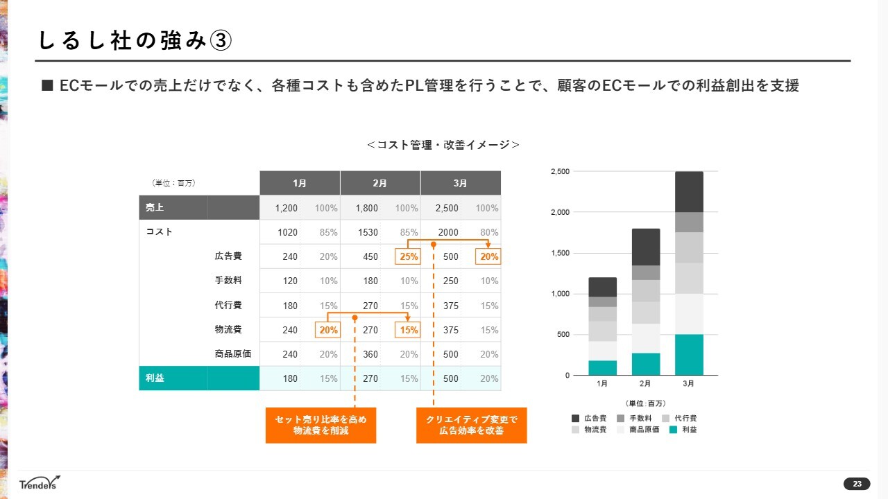3つ目のしるし社の強みです。ECモールでの売上だけでなく、さまざまなコストを適切に削減し、より多くの利益を創出する体質を目指しています。単純に売上(トップライン)だけを増やすのではなく、利益にもコミットしていきます。