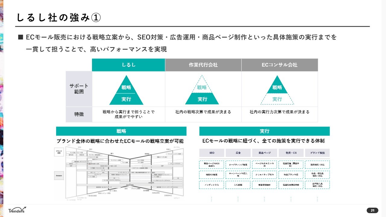 その中でしるし社は、ECモールでの売上をどのようにして上げていくかという戦略立案から、実際のECモール内での広告運用、商品ページの作成・更新、物流、カスタマーサポート(CS)対応まで、モール運営に必要なすべての業務を包括的に請け負うことができます。