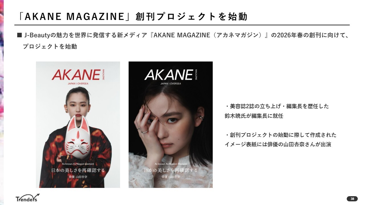 こちらは、新しいプロジェクトです。当社ではこれまで「Mimi Beauty」というSNSメディアで美容メディアを運営してきましたが、2026年春の発刊を目指して新たに『AKANE MAGAZINE』という紙媒体の美容誌を立ち上げる創刊プロジェクトを始動しました。
