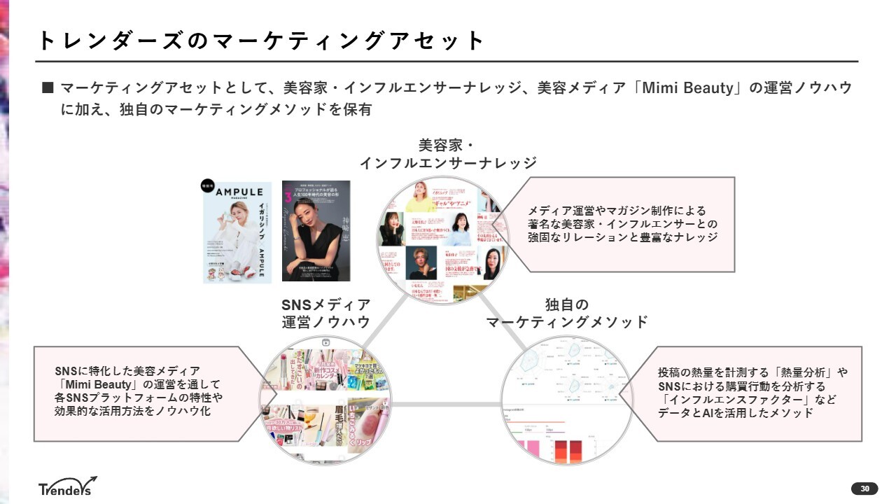 3つ目は、独自のマーケティングメソッドです。当社はインフルエンサーの提供やメディアのタイアップ提供にとどまらず、マーケティング会社として独自のメソッドを有しているだけでなく、その開発を続けています。