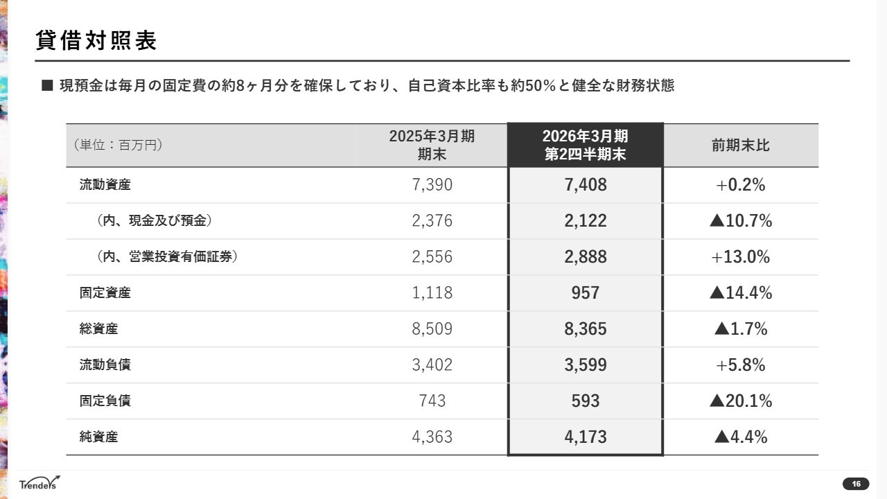 貸借対照表にも特段大きな変化はなく、引き続き健全な財務状態です。今回M&Aを発表しましたが、M&A実施後も手元資金は十分に確保できており、健全な財務状態を維持していると認識しています。