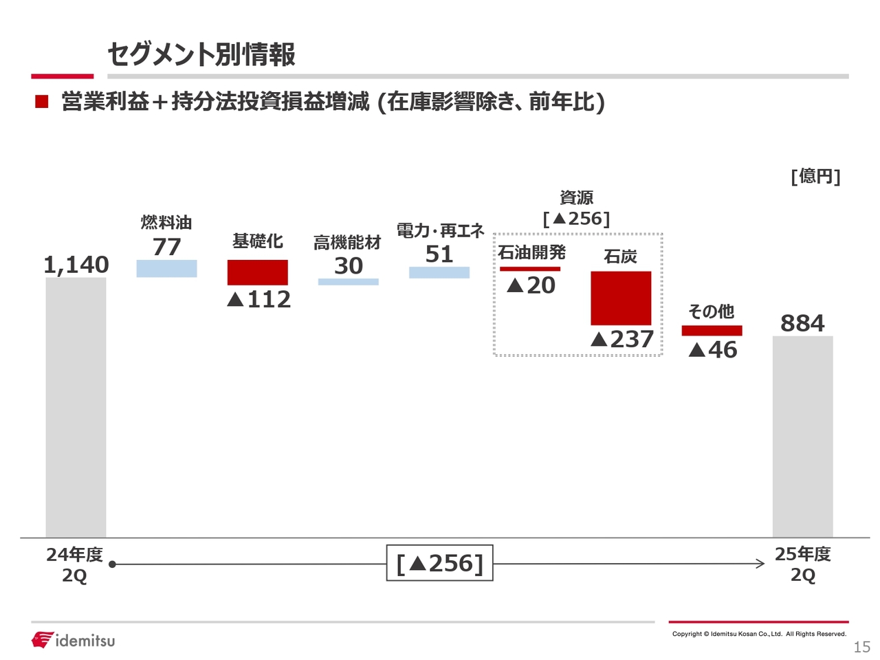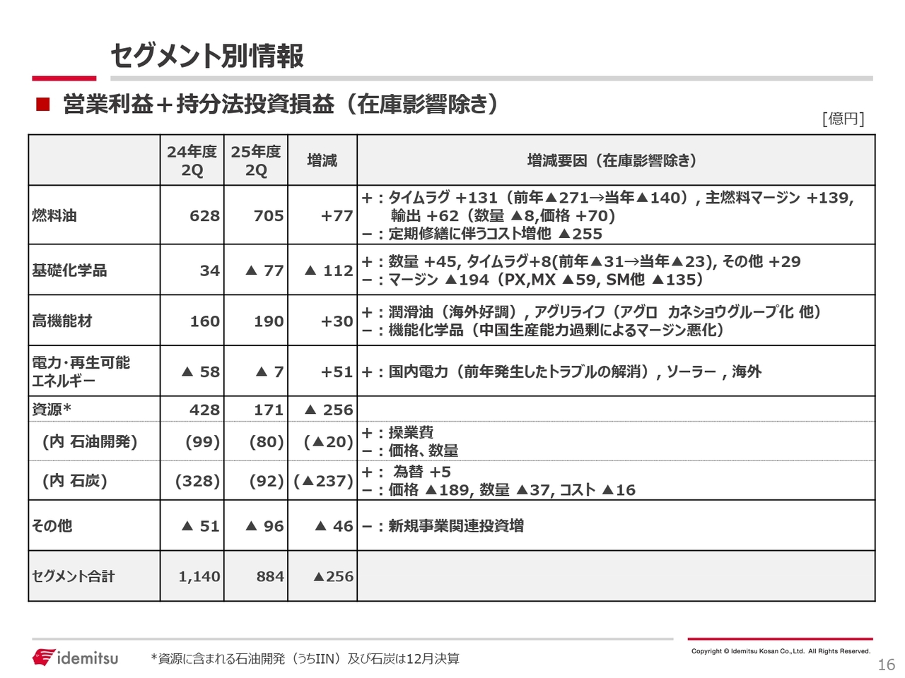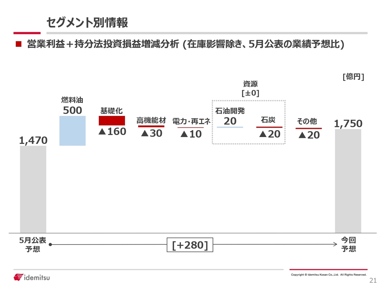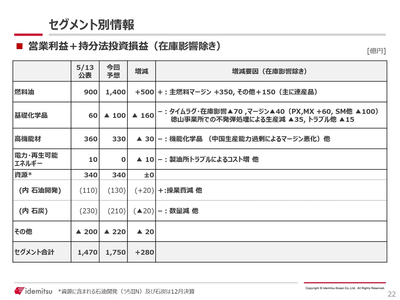 先ほど触れたとおり、燃料油事業は国内の堅調な市場環境と連産品である硫黄、C重油の市況改善が寄与し、在庫影響を除く営業利益プラス持分投資損益は1,400億円となり、5月公表比で500億円の増加を見込んでいます。