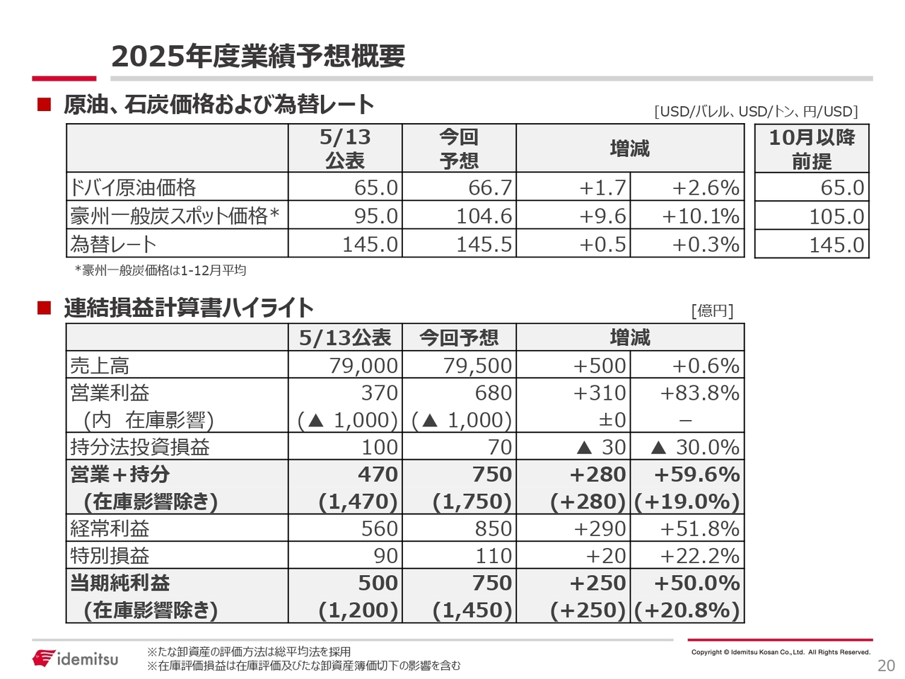 実際、このマイナス影響は上期に発現しました。先ほどの上期の進捗でも触れましたが、国内の燃料市況が想定よりも堅調に推移したため、営業プラス持分利益を280億円、当期純利益を250億円上方修正することとしました。