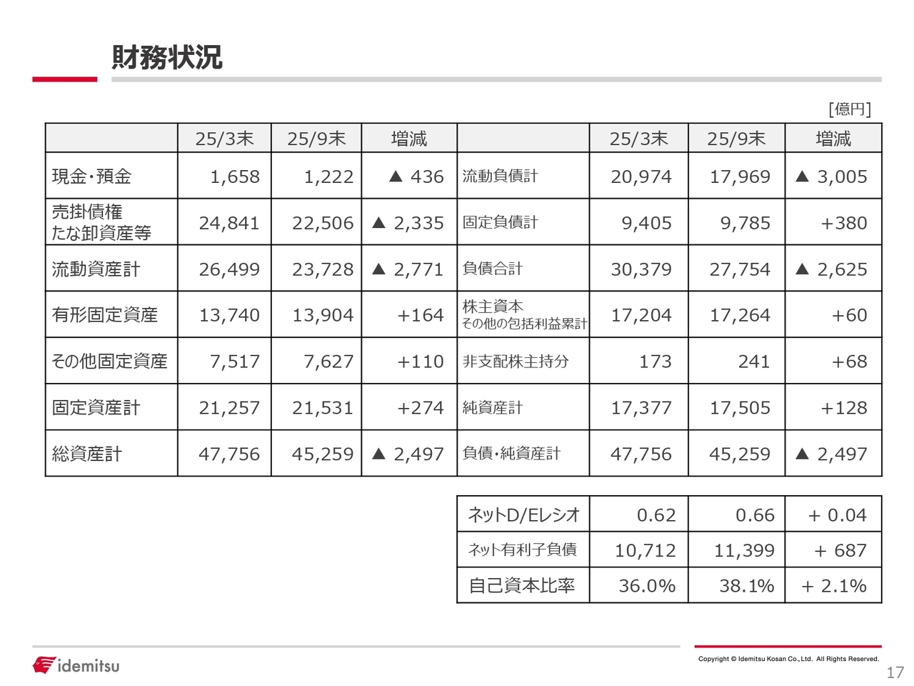 主な指標は右下に記載のとおりです。ネットD/Eレシオは0.66倍、自己資本比率は38.1パーセントと、財務体質の強化が順調に進んでいます。