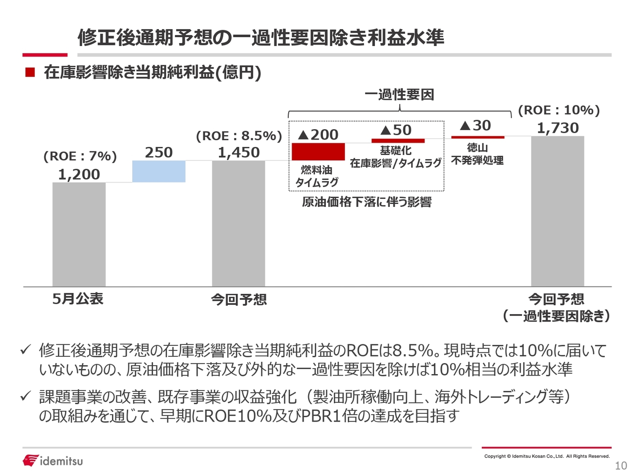 今回修正を加えた在庫影響を除いた当期純利益は1,450億円の水準となり、これに基づくROEは8.5パーセントとなります。残念ながら10パーセントにはまだ届かない結果となりました。