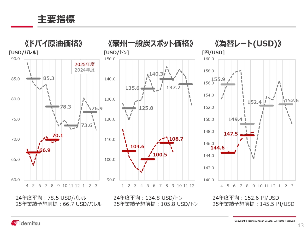 スライドには、事業環境を示す主要な指標を掲載しています。原油価格、石炭価格、為替の推移について示しており、グレー部分が昨年の実績、赤色部分が今年の実績を表しています。