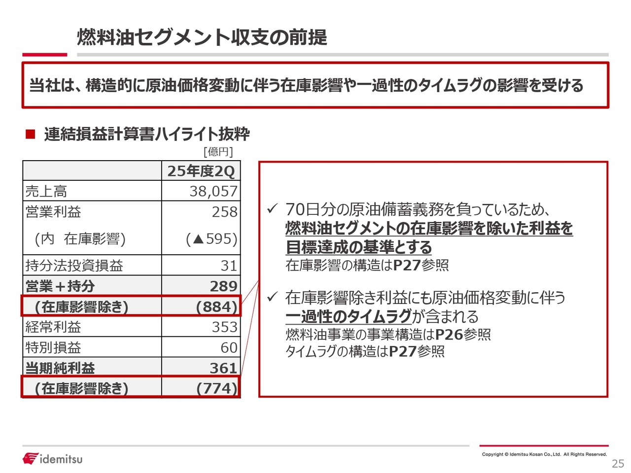 今回の決算説明資料の25ページから28ページでは、燃料油セグメントの収支構造について説明をしています。業界特有のボラティリティの高さ、在庫影響、タイムラグなどの要因を踏まえ、収支構造をあらためて掲載しました。このセグメントへの理解をさらに深めていただくため、図式を中心とした説明資料を数枚加えています。
