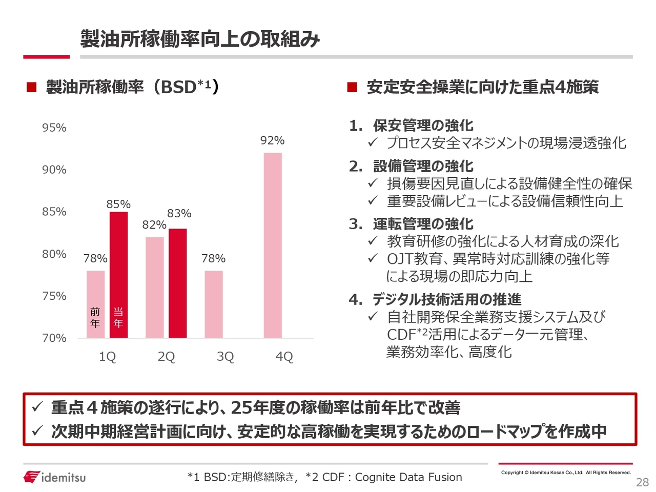 この取り組みについては、来春に公表予定の次期中期経営計画の中で、経営に大きな影響を与える要素として取り上げます。特に、製造部門と製油所の稼働において、高い稼働率を安定的に継続するための取り組みについて説明できる資料を用意する予定です。