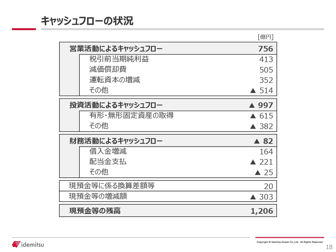投資活動におけるキャッシュフローは、豪州ですでに生産中の石炭鉱山権益の追加取得や固体電解質への戦略投資、さらに製油所等への維持・更新投資を含めて997億円となっており、その差額分を借入金と現金の取り崩しでバランスさせています。