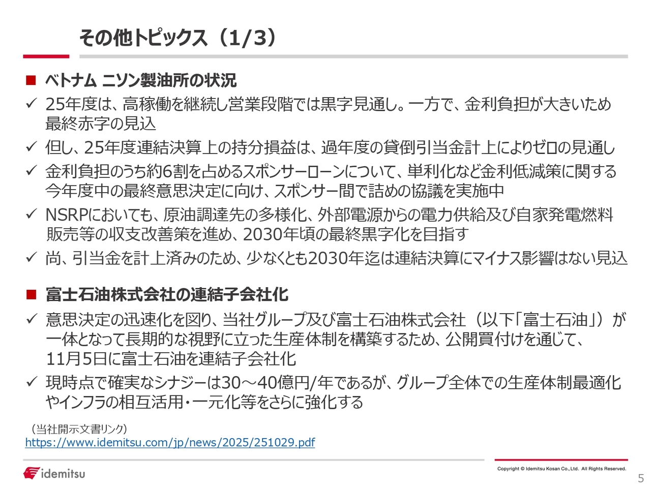 営業利益の段階では想定以上に高稼働・安定稼働が続いています。私も3週間前にNSRPを訪問しましたが、現地の経営幹部やベトナム人の製油所長が非常に高いモチベーションを持ち、現地スタッフとともに安定して高稼働を維持してくれている状況です。