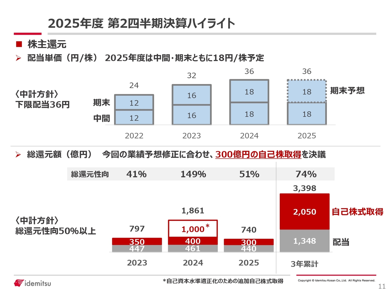 株主還元の詳細です。配当について、当社は2022年度より段階的に引き上げてきました。今回は安定配当を継続し、中間・期末ともに1株18円、年間36円を据え置いています。また、自己株買いについては、業績予想の上方修正に伴い、300億円の取得を決議しました。