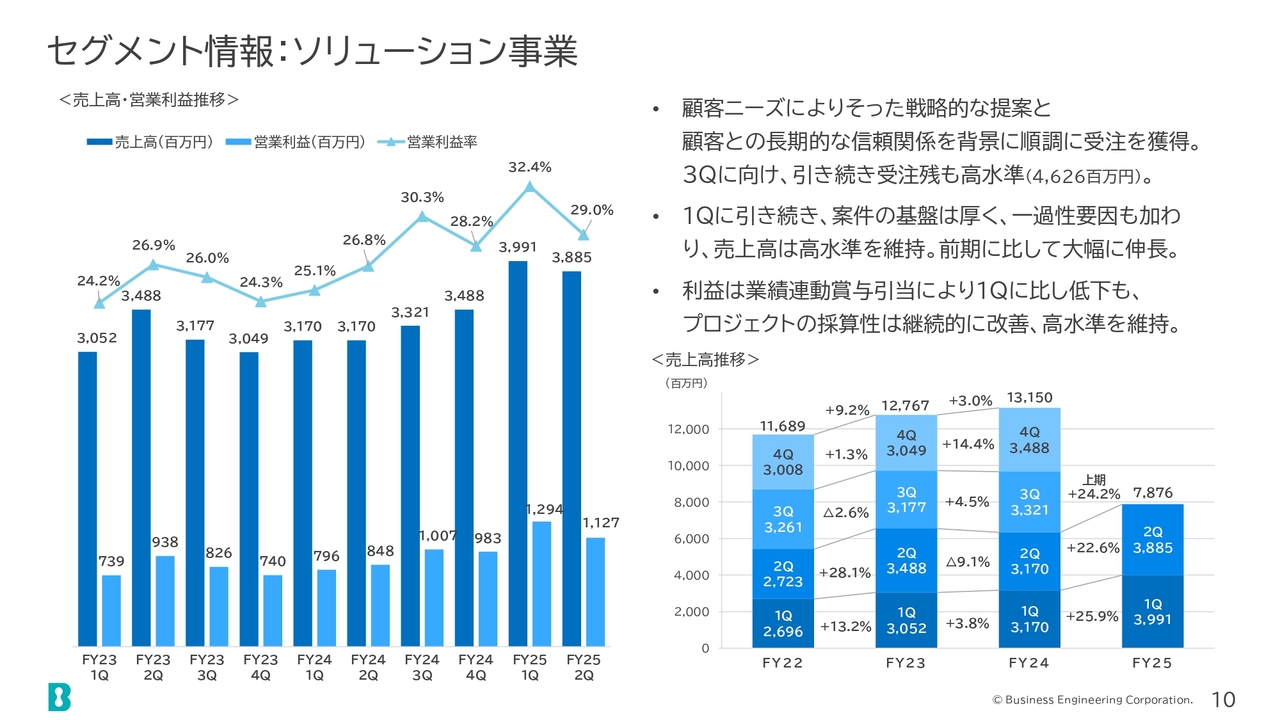 ソリューション事業についてご説明します。お客さまのニーズに沿った提案を実施した結果、受注は堅調に推移しています。第1四半期に続いて案件の引き合いが強く、一過性の要因も加わり、売上高は前期を大幅に上回りました。