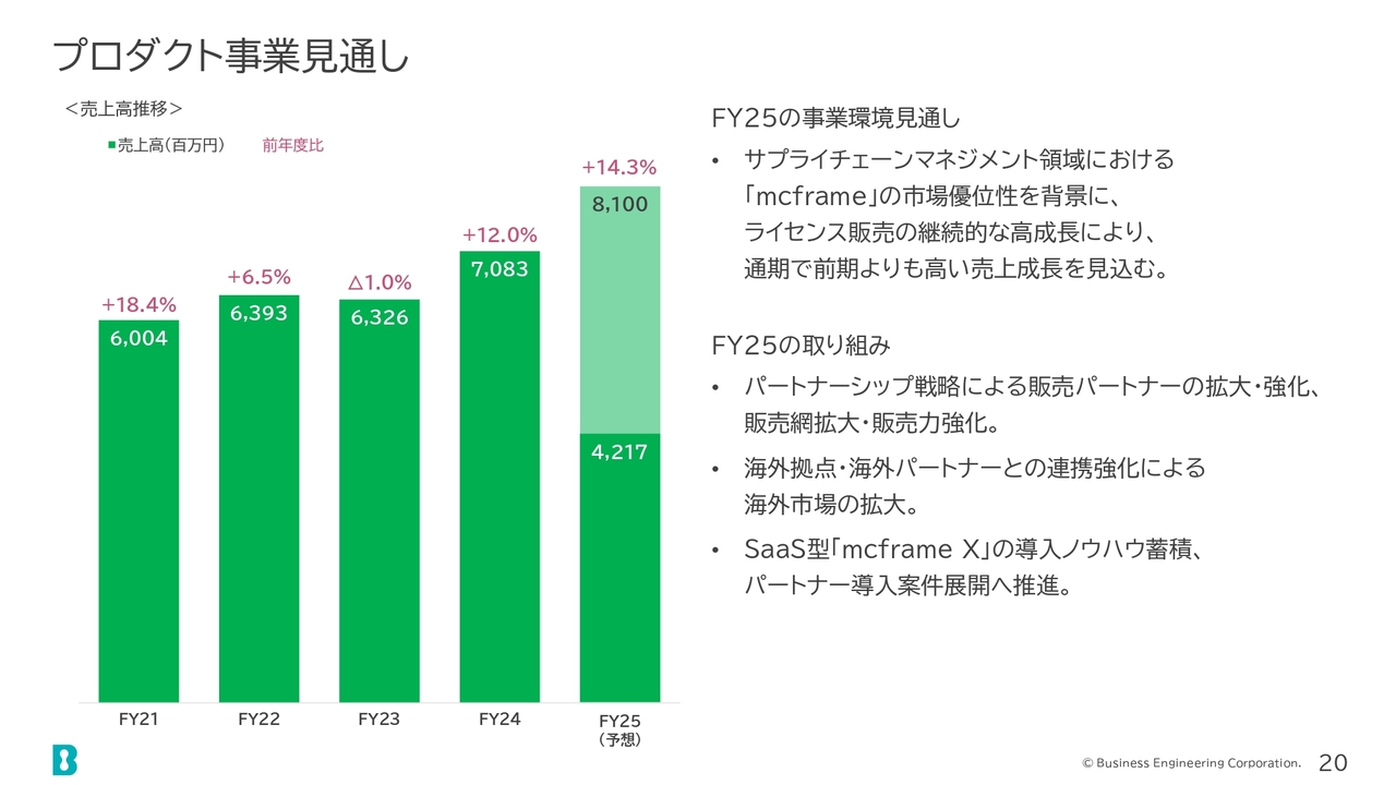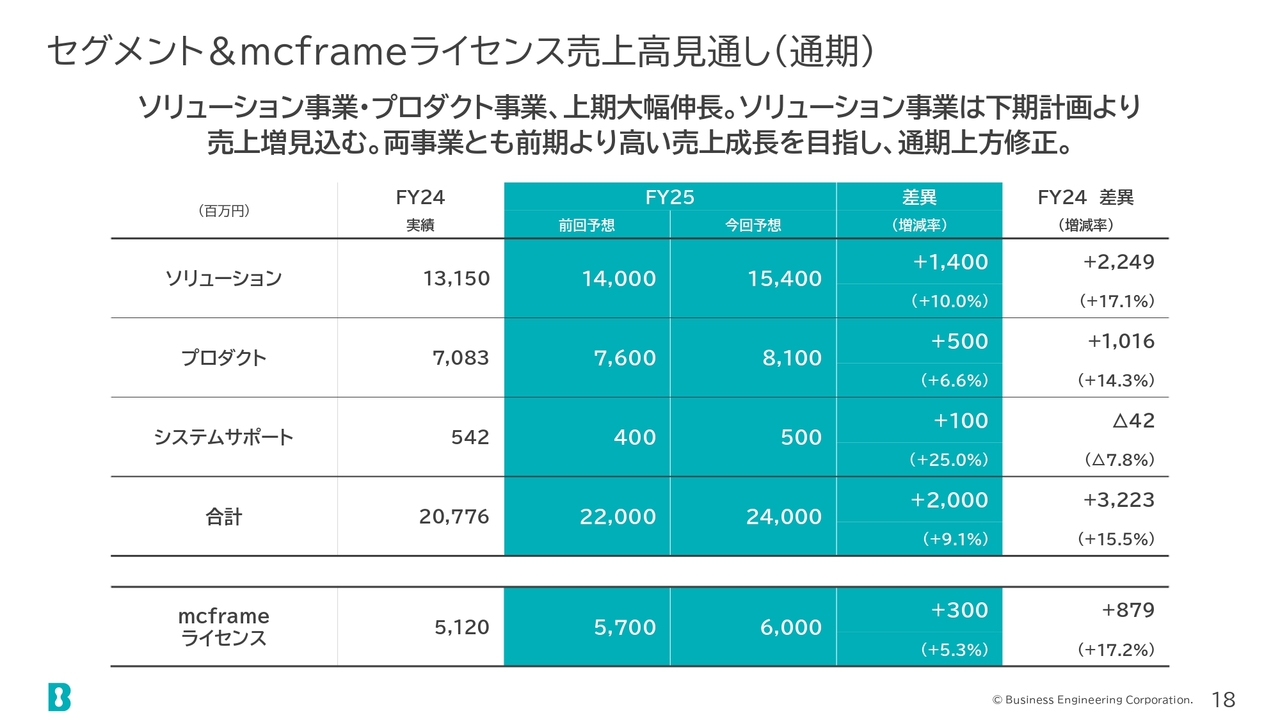 プロダクト事業については、「mcframe」の市場優位性を背景に、下期でもライセンス販売の大幅な売上増加を見込んでいます。