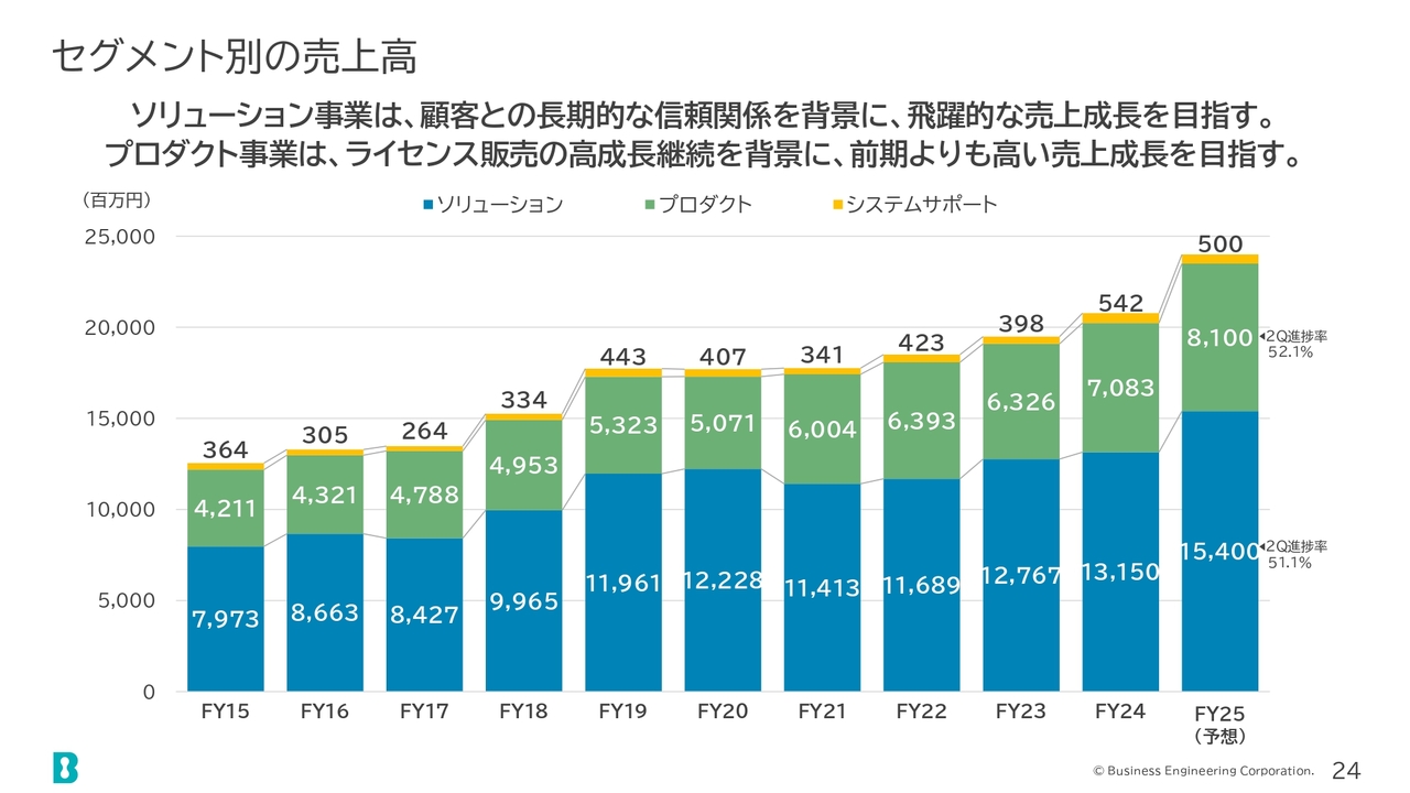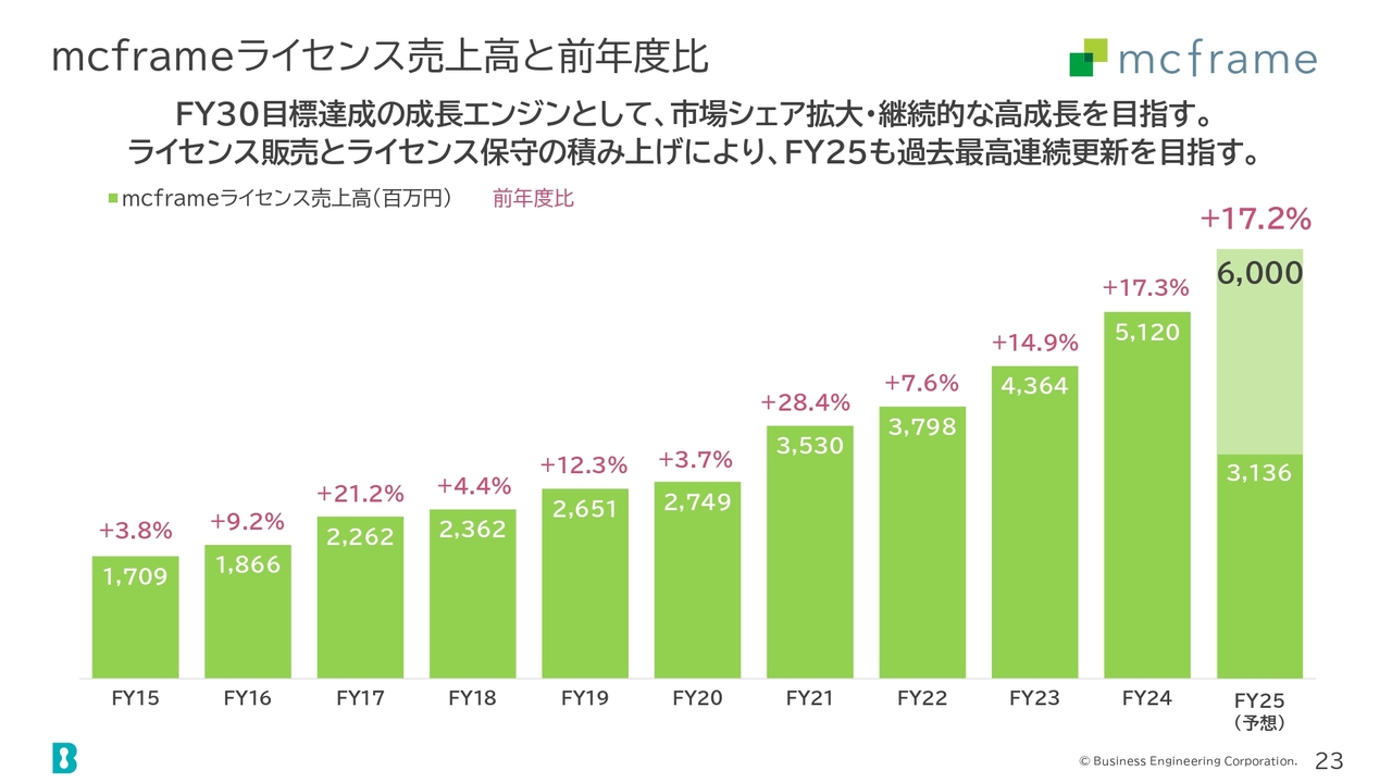 「mcframe」のライセンス売上高については、昨年度である2024年度に前年度比17パーセントを超える大きな伸びを記録しましたが、2025年度も引き続き、前年度比17パーセントを超える大きな伸びを見込んでいます。