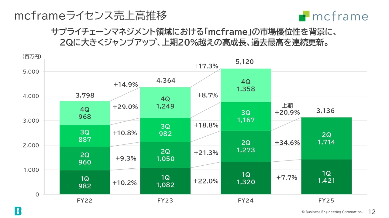 「mcframe」ライセンスの売上高の推移についてご説明します。サプライチェーンマネジメント領域における「mcframe」の優位性を背景に、第2四半期の売上が大幅に伸びました。上期全体で前期比20パーセントを超える高い成長を記録しています。