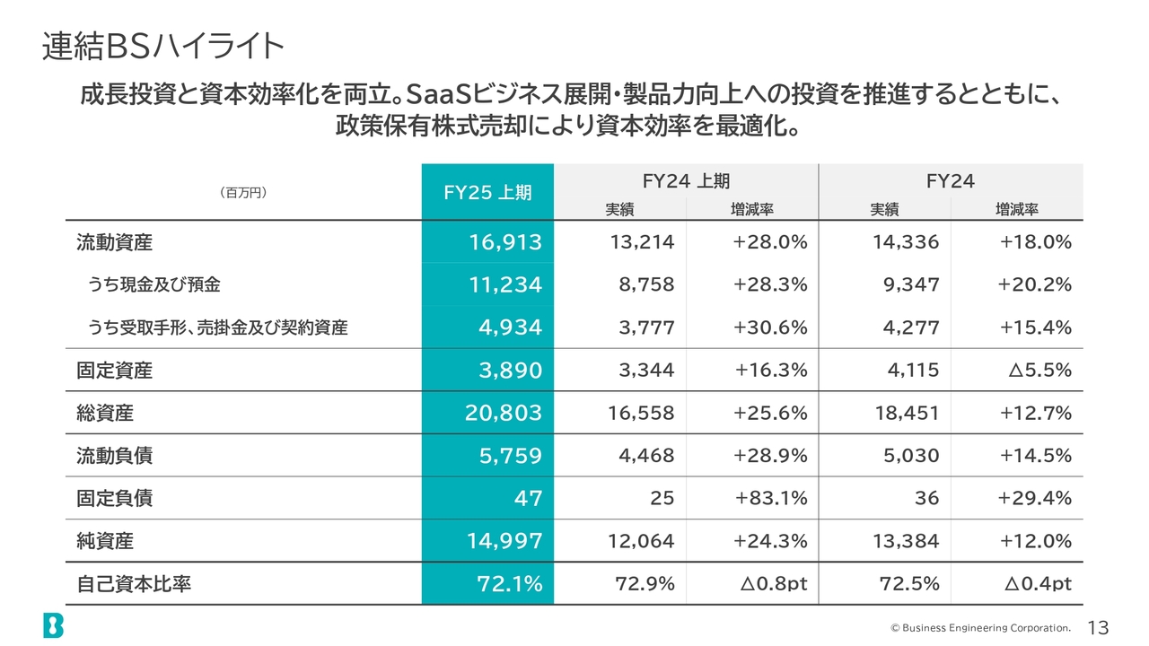 連結B/Sのハイライトについてご説明します。製品への成長投資や政策保有株の売却を通じて、資本効率の最適化を図りました。