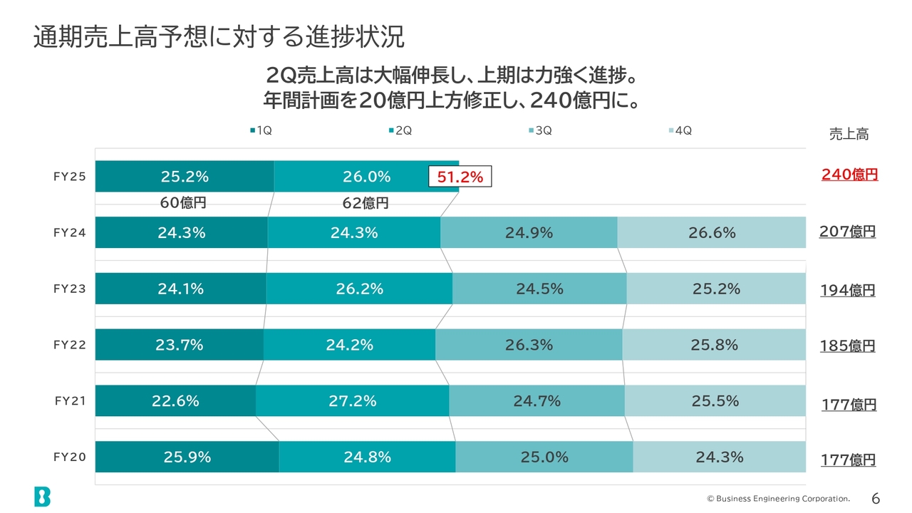 これにより売上高の年間計画を20億円上方修正し、240億円と見込んでいます。この計画値に対する上期の進捗率は51.2パーセントです。