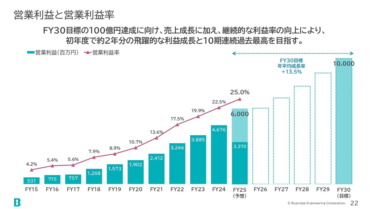 営業利益についても、「BE 2030」の2030年度最終目標である100億円に対して、約2年分に当たる60億円という大きな伸びを見込んでいます。
