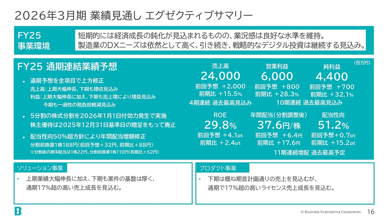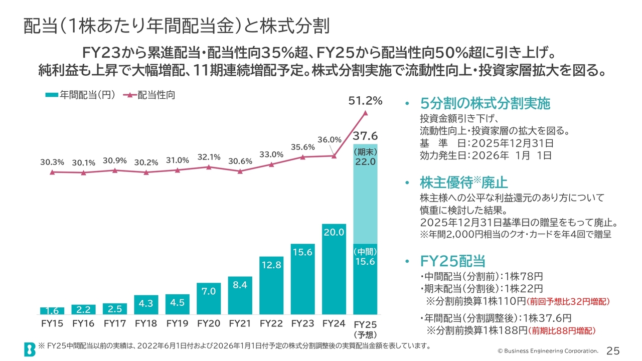 2025年度の配当については、中間配当が分割前で1株78円、期末配当が分割前換算で1株110円となり、前回予想より32円の増配となります。年間配当の合計は分割前換算で1株当たり188円となり、前期比で88円の増配となります。