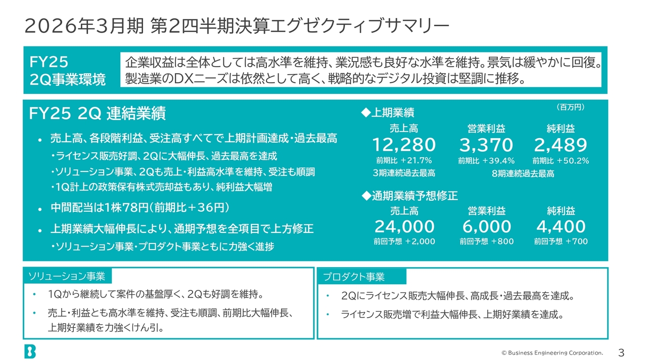 2026年3月期第2四半期決算の概況です。企業収益は総じて高水準を維持しており、製造業のDXニーズは引き続き底堅く、デジタル投資も堅調に推移しました。