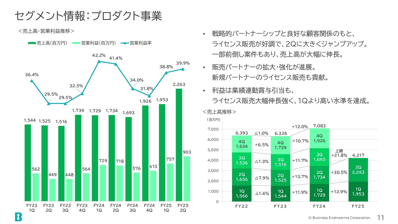 プロダクト事業についてです。戦略的なパートナーシップのもと、ライセンス販売が好調に推移しました。第2四半期は一部前倒し案件もあり、売上高が大幅に伸びています。既存および新規のパートナーによるライセンス販売が貢献し、プロダクト事業の売上が拡大しています。