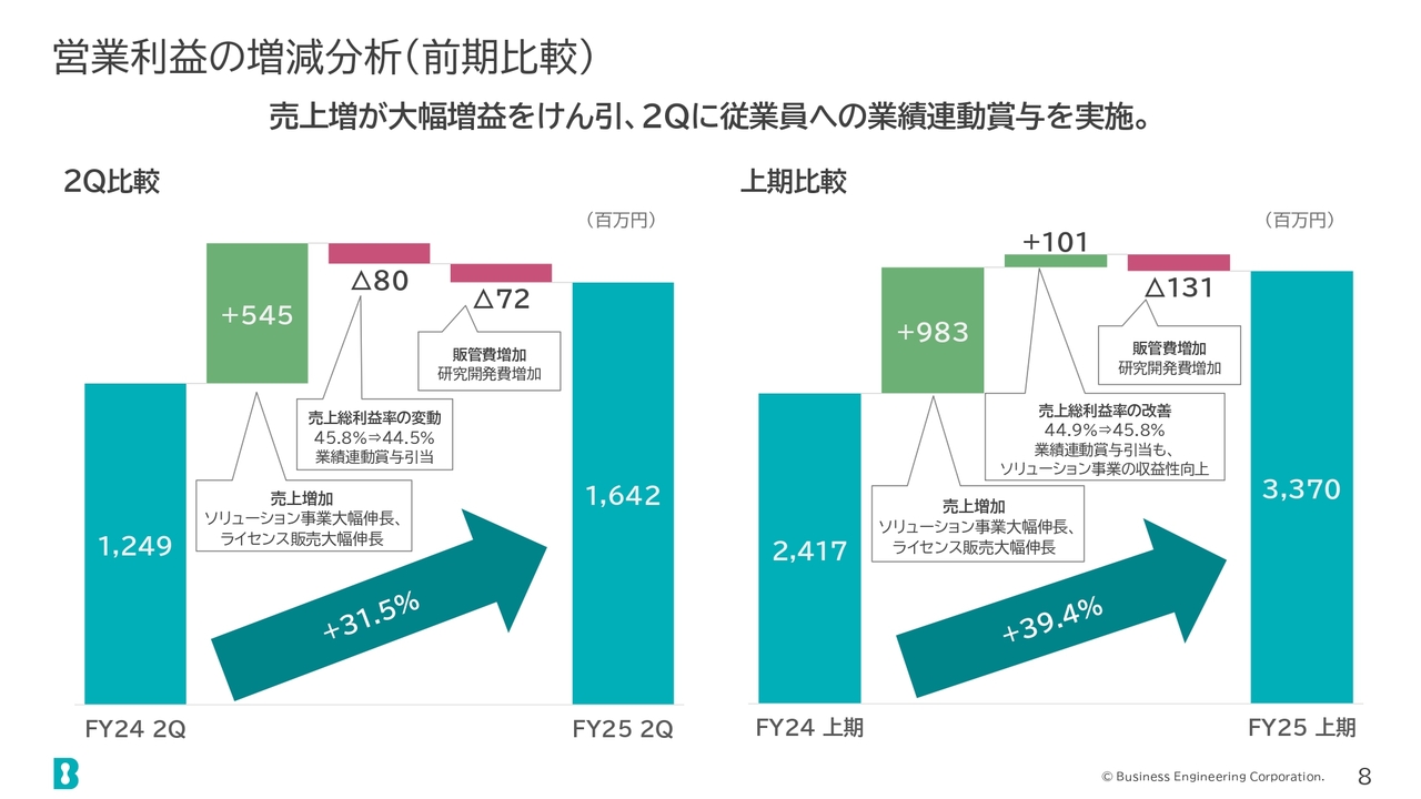 第2四半期には従業員の業績連動賞与の引当を実施しましたが、これらを吸収し、いずれも大幅な増益となりました。