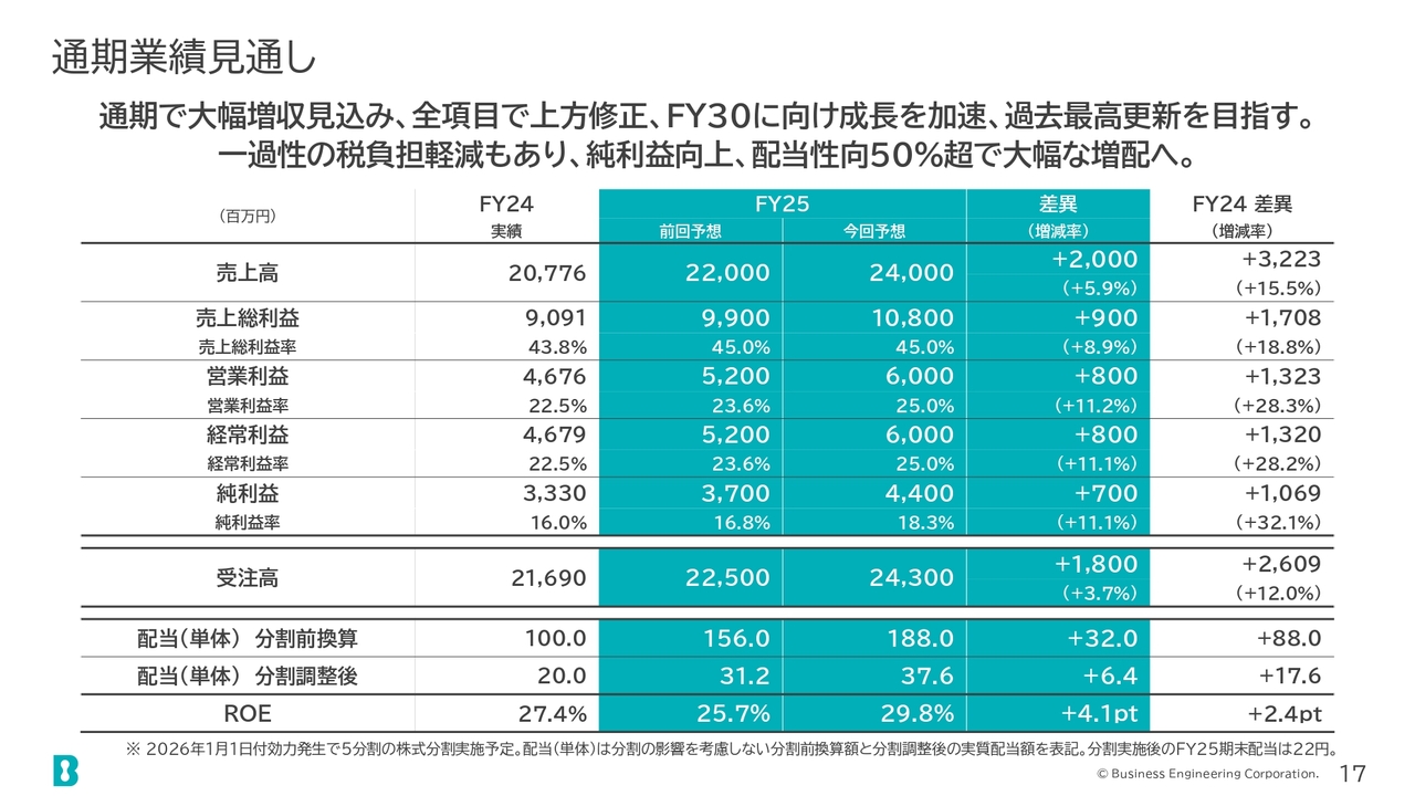 配当は、分割前の換算で188円の予定、ROEは29.8パーセントと予想しています。