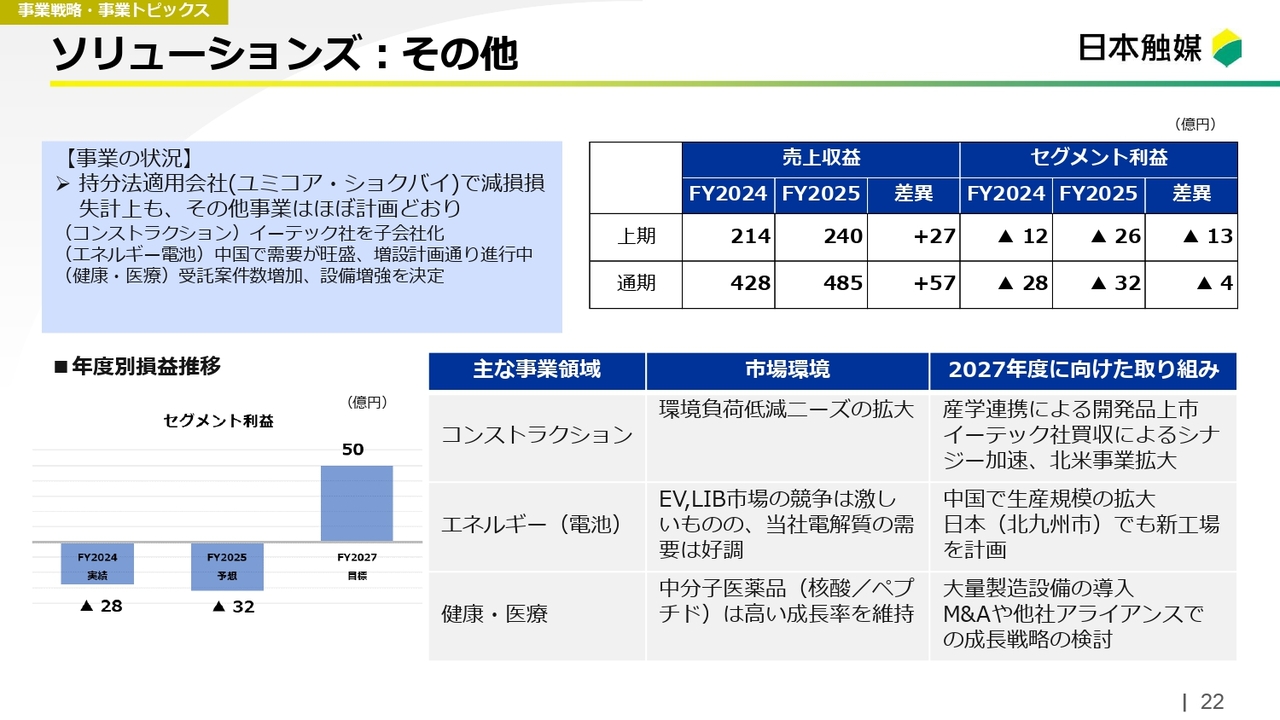 状況としては、先ほど申し上げた持分法適用会社であるユミコア・ショクバイにて減損を計上しましたが、その他はほぼ計画どおりです。