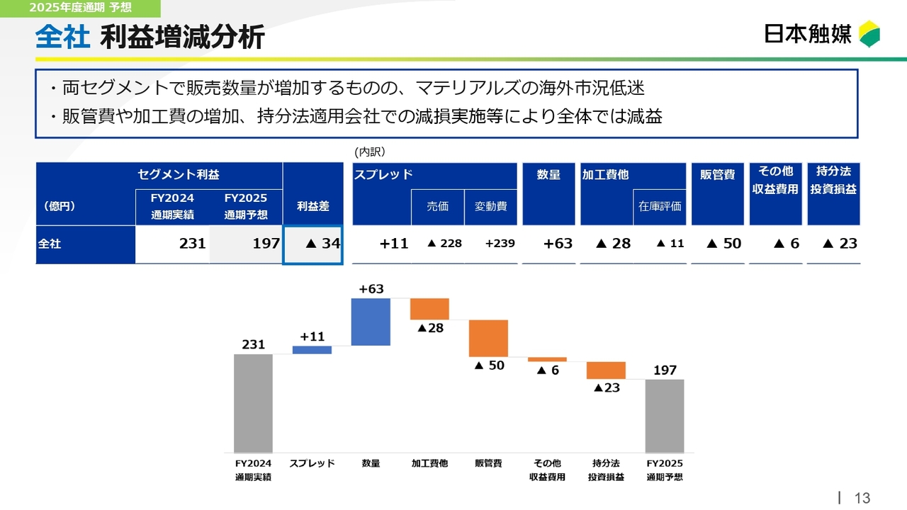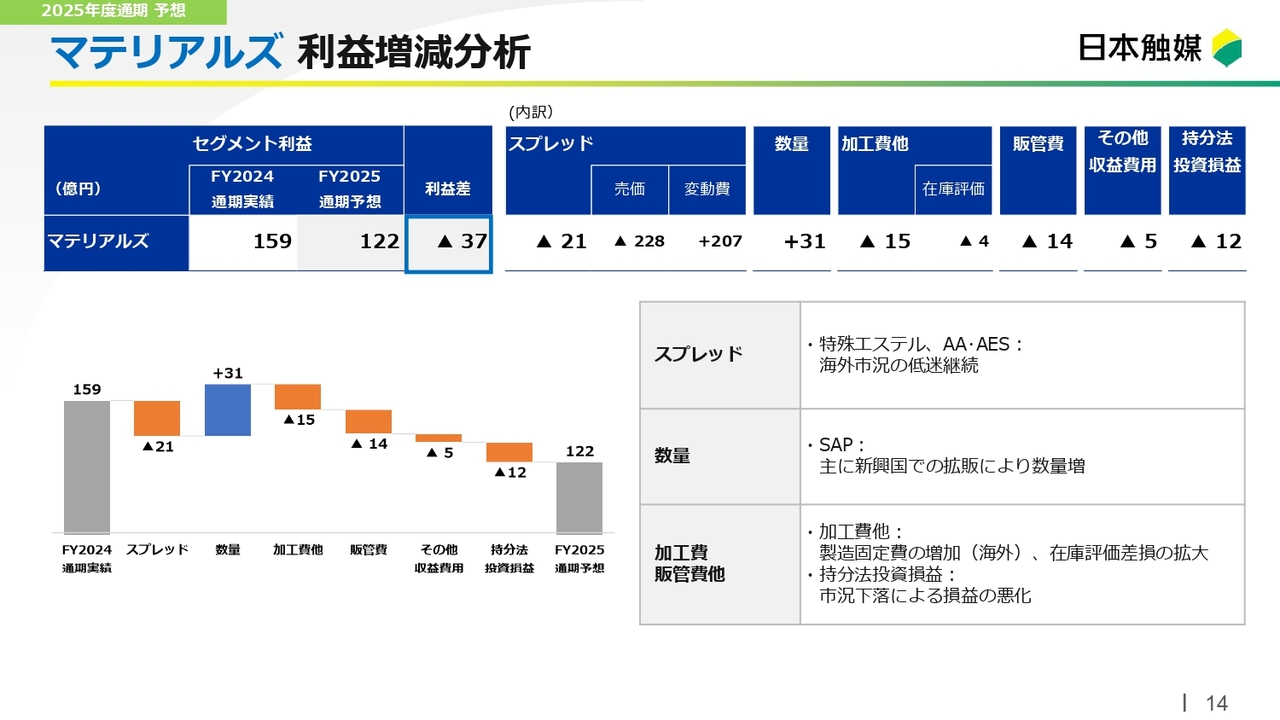 両セグメントともに販売数量は増加するものの、マテリアルズ事業の海外市況低迷などが影響し、減益を予想しています。特に販管費や加工費の増加、さらに持分法適用会社における減損などによって、全体として減益になる見込みです。